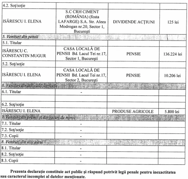 Concret, potrivit ultimei sale declaraţii de avere, guvernatorul BNR are o pensie anuală de 136.224 de lei, respectiv 11.352 de lei pe lună, în timp ce soţia sa, Elena, are o pensie de rând, de numai 1.134 lei lunar.