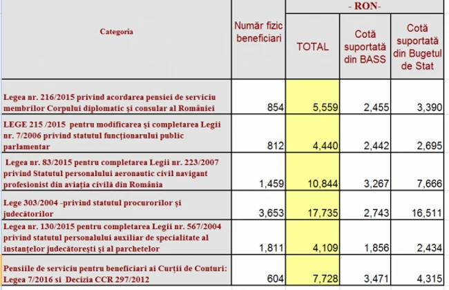 Astfel, în luna ianuarie erau înregistraţi 9.193 beneficiari ai pensilor speciale, faţă de 9.184 în decembrie, pensia medie lunară primită de foştii judecători şi procurori, diplomaţi, politicieni, foşti piloţi din cadrul aviaţiei civile şi foşti angajaţi ai Curţii de Conturi fiind de 10.994 lei în ianuarie, faţă de 10.831 lei în decembrie.