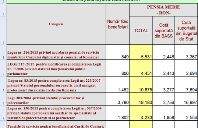 Concret, din datele Casei Naţionale de Pensii Publice, analizate de „Adevărul”, reiese că de pensii mai mari de 10.000 de lei beneficiază, în prezent, doar foştii angajaţi ai Aviaţiei Civile (10.875 lei), şi magistraţii (18.180 lei).