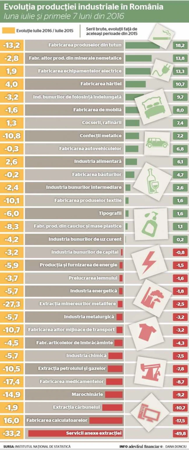 Statisticile INS mai arată că producţia industrială a înregistrat în iulie cea mai mare scădere din acest an, de 3,4% faţă de aceeaşi lună din 2015. În iunie, industria înregistrase un avans modest, de 1,1% faţă de a şasea lună a anului trecut.