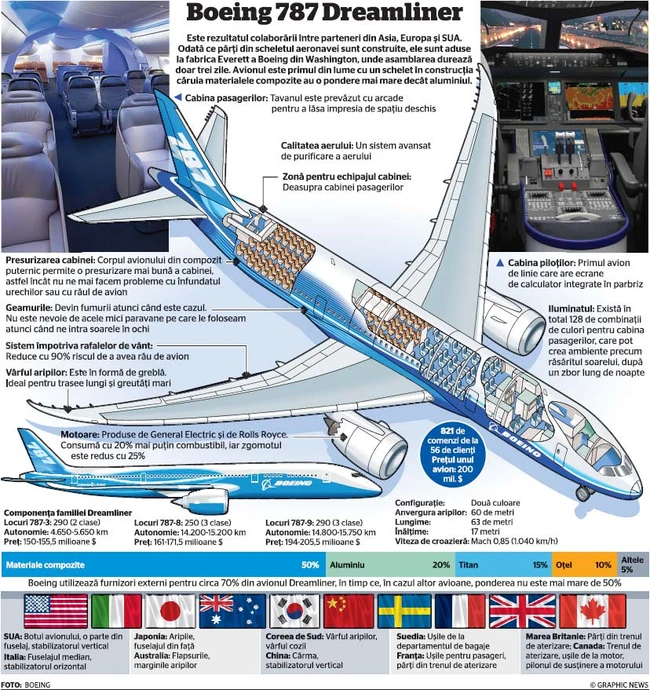 0Mult aşteptatul avion zboară astăzi pentru prima dată, din Statele Unite spre Japonia, cu o întârziere de trei ani. Este prima aeronavă construită din materiale compozite în proporţie de 50%.