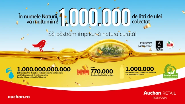 0În cadrul programului de Colectare și Reciclare a Uleiului Alimentar Uzat, în magazinele Auchan, s-au colectat până în prezent 1 milion de litri de ulei, evitându-se astfel aruncarea necorespunzătoare a acestuia și poluarea mediului înconjurător. Inițiativa lansată de Auchan în 2019, primul retailer din România care a introdus un astfel de proiect de colectare a uleiului, a mobilizat până în prezent peste 770.000 de români, care au înțeles efectele dăunătoare pe care uleiul alimentar uzat le are asupra solului și apelor, precum și în generarea unor costuri suplimentare pentru întreținerea și curățarea stațiilor de epurare. De asemenea, acest proiect a condus la reducerea a 2.300 de tone de CO2, care nu au ajuns astfel în atmosferă, uleiul colectat fiind transformat într-un milion de litri de biocombustibil.