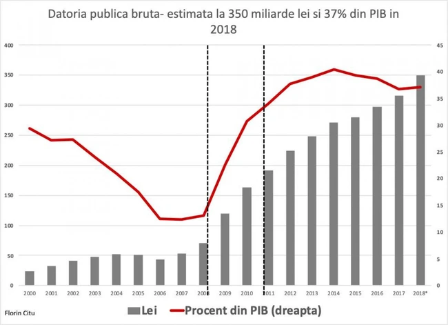 Datoria publică a României a crescut constant din 2009 până în prezent, FMI estimând că aceasta va ajunge la 350 milioane de lei în 2018, scrie senatorul liberal Florin Cîţu pe pagina sa de Facebook.