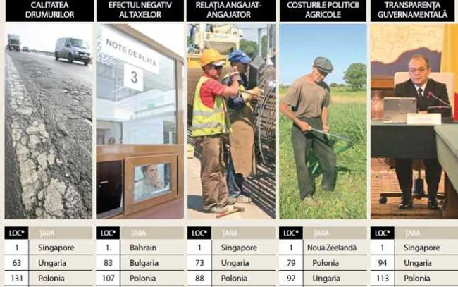 0Ţara noastră se regăseşte de mai mulţi ani pe ultimele locuri în topurile mondiale privind infrastructura, politicile guvernamentale, fiscalitatea, agricultura şi piaţa muncii. Din 139 de state analizate într-un raport asupra competitivităţii globale, România se regăseşte pe poziţii mai joase de 130 la cinci indicatori esenţiali.