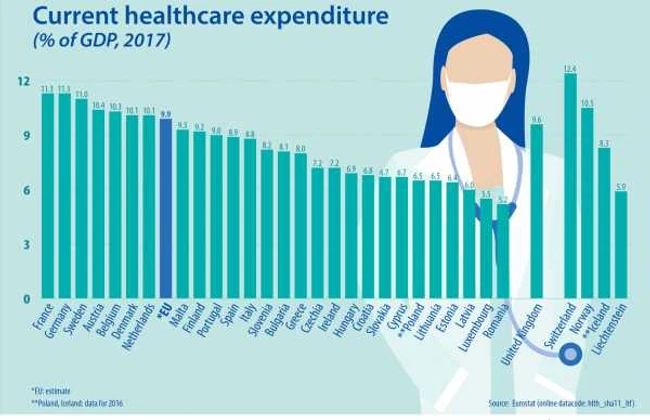 România aloca în anul 2017 doar 5,2% din Produsul Intern Brut pentru sănătate, cel mai mic nivel din Uniunea Europeană. Spre comparaţie, Franţa şi Germania alocau 11,3%, în timp ce Suedia aloca 11% din PIB. Media Uniunii Europene este de 9,9% din PIB.