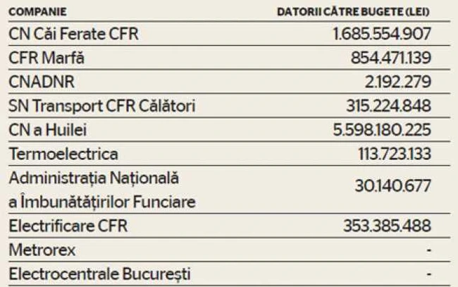 Pentru cele 10 companii de stat - CN Căi Ferate CFR, SN Transport CFR Călători, CN a Huilei, Termoelectrica, CN de Autostrăzi şi Drumuri Naţionale, Metrorex, CFR Marfă, Electrocentrale Bucureşti, Electrificare CFR şi Administraţia Naţională a Îmbunătăţirilor Funciare - vor fi fixate ţinte trimestriale de EBIT (câştiguri înainte de dobânzi şi impozite), excluzându-se subvenţiile.