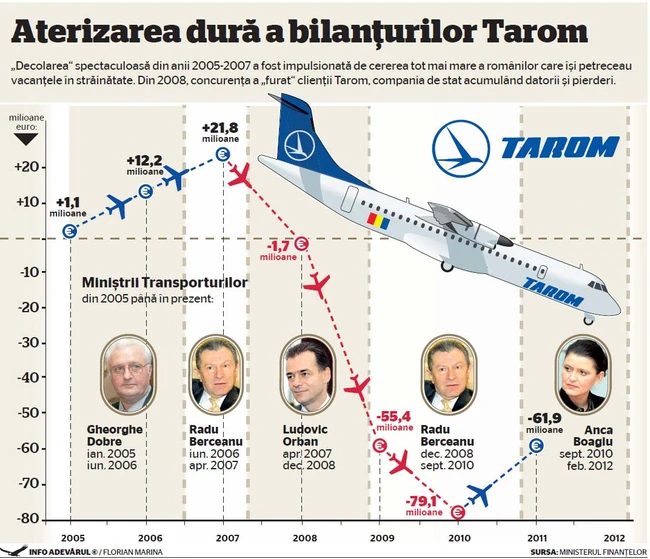Cu venituri tot mai mici din operare (pentru că între timp a apărut o concurenţă puternică pe rutele tradiţionale) şi nevoită să acopere cheltuieli tot mai mari de întreţinere, Tarom a ajuns în scurt timp la pierderi ce depăşesc limitele rezonabilului. Cu un milion de euro pierderi în 2008 (după profitul de 21,8 milioane în anul precedent!), paguba companiei a ajuns în 2011 la aproape 62 de milioane de euro.