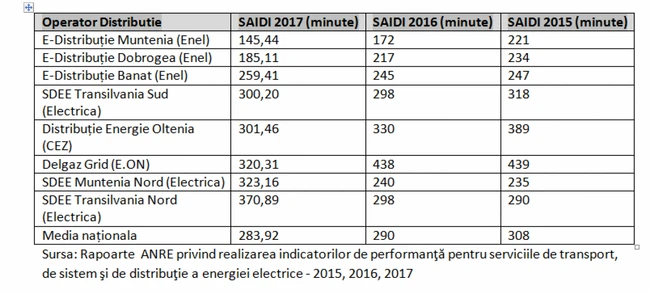 Acele mai recente date publicate de către ANRE, pentru anul 2017, arată că media naţională a fost de 283,92 minute, în uşoară scădere faţă de 290 de minute în anul 2016.
