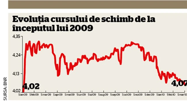 Banca Naţională a României (BNR) a anunţat pentru astăzi un curs de schimb de 4,0716 lei/euro, cel mai redus nivel din ianuarie 2009 şi până în prezent. Un curs mai scăzut a fost atins la 6 ianuarie 2009, când banca centrală a anunţat o referinţă de 4,0629 lei/euro.