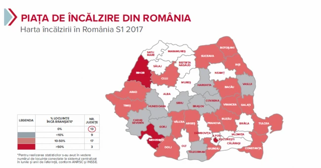 În prezent, 13 judeţe din România (Alba, Mureş, Maramureş, Bistriţa Năsăud, Satu Mare, Ialomiţa, Ilfov, Brăila, Caraş Severin, Neamţ, Dâmboviţa, Olt, Sălaj) nu mai depind de sistemul centralizat de încălzire, folosind un echipament independent de încălzire. La polul opus se află Capitala, unde peste 60% dintre locuinţe depind încă de sistemul centralizat (circa 560.000 de locuinţe branşate).