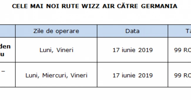 Cele două rute au ca destinaţie Germania, de la Sibiu spre Karlsruhe/Baden Baden şi de la Suceava către München Memmingen. Ambele rute încep din 17 iunie, dar pasagerii români îşi pot planifica încă de astăzi călătoriile în aceste oraşe, biletele fiind deja disponibile pe wizzair.com cu preţuri începând de la 99 RON / 19,99 EUR.