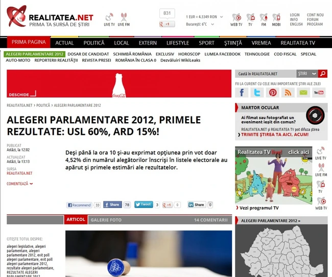 Până în momentul de faţă, site-urile antena3.ro şi realitatea.net au oferit rezultatele pe site, fără a le ascunde şi fără a păstra legalitatea. Practic, vorbim de influenţarea audienţei prin prezentarea rezultatelor înainte de finalul scrutinului, chiar în momentul când nu au fost la vot decât aproximativ 5% din români.