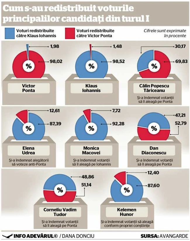 De partea cealaltă, Victor Ponta a primit foarte multe voturi de la electoratul lui Călin Popescu Tăriceanu. Nimic surprinzător, din moment ce Ponta l-a prezentat pe Tăriceanu drept viitor premier. Marea surpriză a fost oferită de votanţii lui Dan Diaconescu şi Corneliu Vadim Tudor. Deşi au fost plimbaţi prin studiourile Antena 3 şi RTV, deşi l-au recomandat din toată inima pe Victor Ponta, alegătorii „Tribunului“ şi ai „domnului Dan“ s-au arătat a fi indisciplinaţi şi s-au împărţit aproape în două: jumătate au votat cu Ponta, cealaltă jumătate cu Iohannis. „Dacă facem un calcul în voturi, luându-i în calcul pe votanţii Elenei Udrea, Monicăi Macovei, Kelemen Hunor, Călin Popescu Tăriceanu, Dan Diaconescu şi Vadim Tudor, din turul 1, putem vedea că Victor Ponta a atras în turul II de la aceştia 874.555 de voturi, în timp ce Klaus Iohannis a atras 1.610.883 de voturi. Putem trage concluzia că Iohannis a reuşit să atragă dublu faţă de contracandidatul său de la ceilalţi candidaţi din primul tur“, arată analiza lui Valdimir Ionaş, sociolog Avangarde.