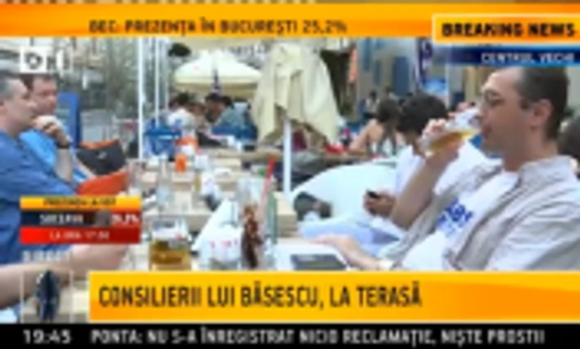 Consilierii lui Traian Băsescu, Cristian Diaconescu, Iulian Chifu, Bogdan Drăgoi şi Bogdan Oprea, au plecat de la sediul de campanie la o terasă în Centrul Vechi. Surse apropiate spun că şansele să vină şi preşedintele sunt minime.
