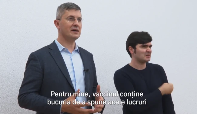 Ulterior, Barna interpretează şi el în limbaj mimico-gestual: "Mergeţi şi voi să faceţi vaccin!".