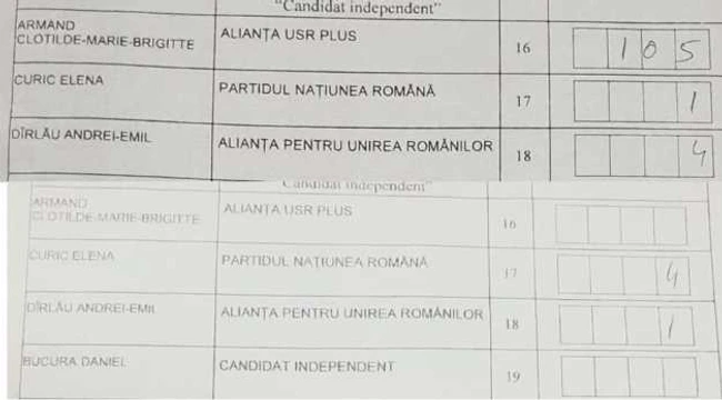 Datele comparative ale celor două procese verbale emise de Secţia de votare 156 demonstrează că nu doar Clotilde Armand, candidatul USR PLUS, a fost furată, ci şi cel al PSD, Daniel Tudorache. În schimb, candidaţii PMP şi ALDE au primit voturi în plus.