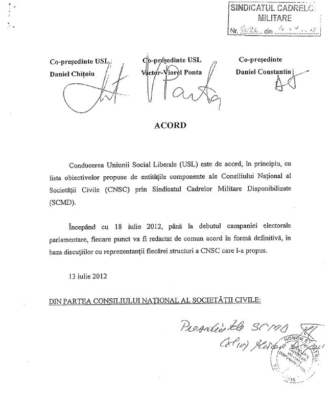 Documentul încheiat între USL şi Sindicatul Cadrelor Militare Disponibilizate a fost semnat pe 13 iulie 2012 şi stabileşte lista obiectivelor comune. Ponta, Chiţoiu şi Constantin şi-au dat acordul pentru desfiinţarea celor mai importante instituţii de luptă împotriva corupţiei: Direcţia Naţională Anticorupţie, Agenţia Naţională de integritate, Consiliul Naţional de Studiere a Arhivelor Securităţii şi Curtea Constituţională.