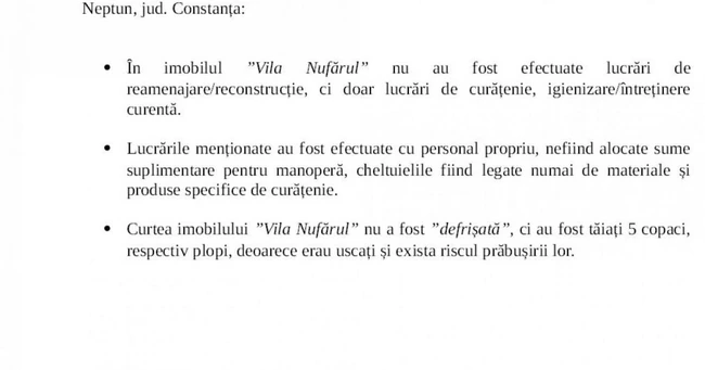 - În imobilul ”Vila Nufărul” nu au fost efectuate lucrări de reamenajare/reconstrucţie, ci doar lucrări de curăţenie, igienizare/întreţinere curentă.