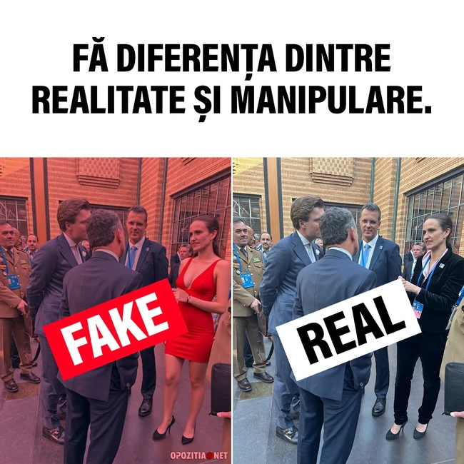 În realitate, imaginea originală o arată pe Oana Țoiu la summitul NATO de la Haga, unde discuta cu partenerii internaționali despre apărare și combaterea atacurilor hibride, într-un context în care „frecvența campaniilor de dezinformare bazate pe informații și imagini false crește”.
