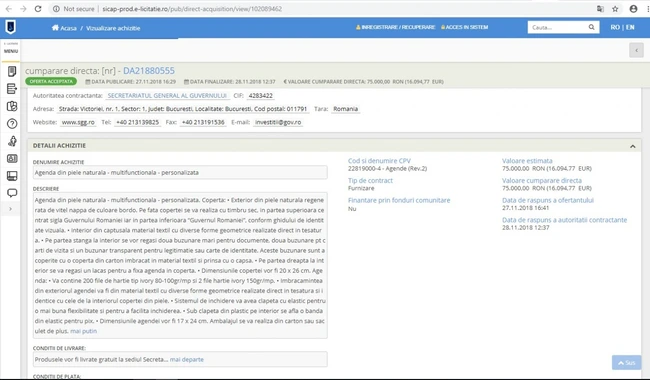 Potrivit portalului de achiziţii publice, Guvernul României a achiziţionat la sfârşitul lunii noiembrie, prin Secretariatul General, 100 de agende personalizate, fiecare în valoare de 750 de lei, scrie G4media. În total, investiţia Executivului în obiectele de papetărie se ridică la 75.000 de lei, mai exact 16.000 de euro.