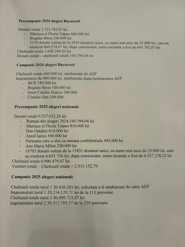 În precampania din alegerile locale din 2024 - o să vă dau această hârtie cu datele exacte - în precampania din 2024 pentru alegerile locale, am avut donații de 1.750.000 de lei și cheltuieli de 1.600.000 de lei, deci diferența dintre donațiile pe care le-am primit și cheltuielile pe care le-am făcut - 145.000 de lei. Dintre donatori, Măriuca și Florin Talpeș - 660.000 de lei, Bogdan Micu - 250.000 de lei, astea sunt sumele mai mari de 5.000 de euro, și 3.179 donații online de la 2.954 de donatori care au donat prin platformă, suma strânsă a fost de 843.000 de lei. Asta a fost precampania, unde, după cum știți, cheltuielile nu sunt rambursate de stat.