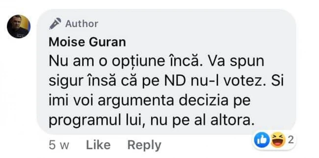 În urmă cu mai multe săptămâni, dinainte să se înscrie în USR, Moise Guran afirma într-un comentariu pe Facebook că „în mod sigur” nu îl va vota pe Nicuşor Dan pentru Primăria Capitalei.