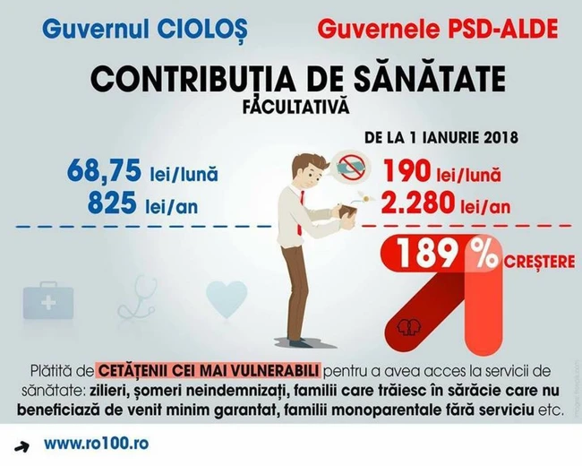 0Platforma România 100 prezintă o comparaţie între asigurarea facultativă de sănătate în perioada Guvernului Cioloş şi acum, afirmând că ”revoluţia fiscală a PSD-ALDE a dus la o creştere cu aproape 200% a contribuţiei de sănătate pentru cei mai vulnerabili dintre cetăţenii români”. Dacă în 2016 se plătea suma de 68,75 de lei pe lună, de la 1 ianuarie suma ajunge la 190 de lei pe lună pentru cei care vor să beneficieze de servicii medicale.