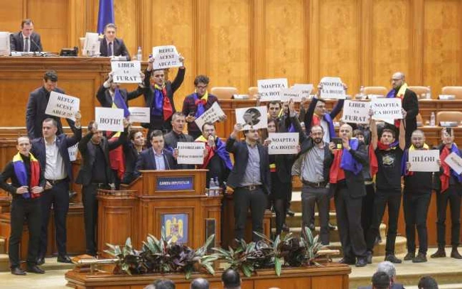 ”Nu acceptăm acest abuz”, au început să scandeze toţi senatorii PNL şi USR, afişând pancarte pe care scria ”Ruşine” şi ”Noaptea ca hoţii”şi bătând cu pumnul în bănci.