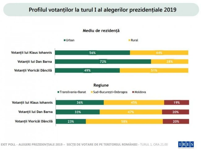 Conform IRES, votanţii lui Barna fac parte, covârşitor, din mediul urban (în proporţie de 72%), în tim ce Iohannis a fost votat de românii de la oraşe în proporţie de 56%. Viorica Dăncilă, în schimb, a avut mai mulţi alegători din mediul rural (51%).