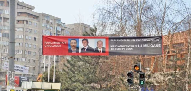 În sectorul 3, condus de liberal-democratul Liviu Negoiţă, la intersecţia străzii Liviu Rebreanu cu Bulevardul 1 Decembrie a fost afişat un banner pe care scrie „Dan Voiculescu-senator chiulangiu. Parlamentarii USL fac grevă de lux, noi plătim pentru ei 1,4 milioane de euro". Trecătorii îşi aruncă privirea, unii chiar se opresc să citească cu atenţie, dar literele mari şi poza încruntată a liderului PC nu îi fac decât să-şi exprime mâhnirea faţă de actuala Putere.