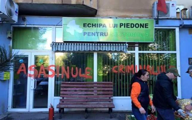 0Fostul edil Cristian Popescu Piedone susţine că sediul său de campanie a fost vandalizat de oamenii actualului primar interimar, Daniel Băluţă, candidatul PSD la Primăria Sectorului 4. Pe geamul sediului de campanie al lui Piedone a fost scris „asasinule“ şi criminalule“.