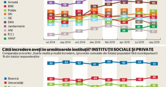 Primele trei poziţii ale topului încrederii în instituţiile executive sunt ocupate şi în luna septembrie de Armată, Jandarmerie şi DNA. Astfel, Armata continuă să se afle în pe primul loc, 73,8% dintre români declarând că au încredere multă şi foarte multă în această instituţie, comparativ cu 75% în luna iulie. Armata este urmată de Jandarmerie cu 63,7% încredere multă şi foarte multă (64,5% în luna iulie) şi de DNA cu 60% (61% în luna iulie).