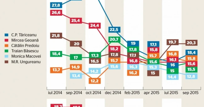 Gabriel Oprea este urmat de Mihai Răzvan Ungureanu cu 20,3% (faţă de 19,7% în luna iulie), Călin Popescu Tăriceanu cu 18,4% (16% în iulie), Alina Gorghiu cu 16,8% (15% luna iulie), Liviu Dragnea cu 16% (9,2% în iulie), Cătălin Predoiu cu 15,8% (16,8% în iulie), Mircea Geoană cu 15,6% (16,1% în iulie) şi Traian Băsescu cu 15,5% (15% în iulie).