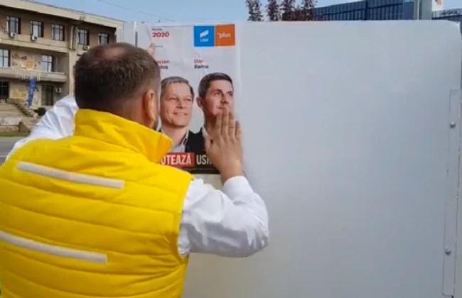 Un consilier liberal din Iaşi s-a filmat în timp ce lipeşte afişe USR-PLUS căzute pe jos. „Noi luptăm cu PSD-ul”