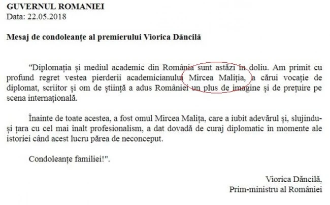0Viorica Dăncilă a făcut o nouă gafă, de data aceasta într-un mesaj de condoleanţe remis de Guvern şi asumat de premier. Numele academicianului Mircea Maliţa, decedat luni seară, apare scris greşit: „Maliţia“ (cu un „i“ în plus).