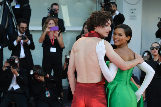Timothee Chalamet, protagonistul pliculei, a avut toată Veneția „la picioare“ la premiera mondială a filmului. Actorul a purtat pe covorul roșu o salopetă strălucitoare, cu spatele gol, într-o nuanță sângerie, în „ton“ cu subiectul filmului.