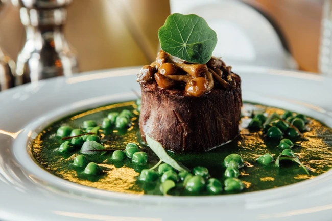 Muşchi de vită din America de Nord asezonat cu clorofilă de spanac şi ciuperci Chanterelle din Sudul Franţei