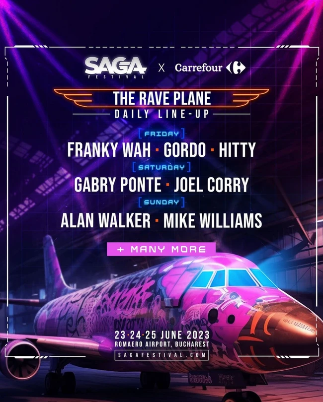 Cea de-a treia ediție SAGA Festival îi așteaptă pe festivalieri să se bucure de scenele Source (Mainstage), Heat (Tehno), Spark (House), dar și Switch hijacked by Hustle. Spre bucuria fanilor, revine SAGA Rave Plane by Carrefour, avionul în care vor avea loc cele mai cool petreceri exclusiviste cu artiștii din line-up-ul de anul acesta. Primele nume confirmate sunt Alan Walker, Franky Wah, Gordo, Hitty, Gabry Ponte, Joel Corry și Mike Williams. Programul și modalitățile de acces vor fi comunicate în curând.