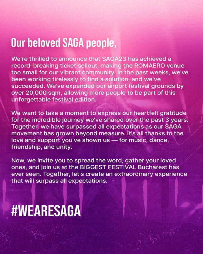 Prezentat de pionierii evenimentelor de muzică electronică, ALDA, parte a familiei Insomniac, SAGA este un festival de muzică inovator, ce are loc pe Aeroportul Romaero din București. SAGA aduce publicului unii dintre cei mai iubiți artiști și o producție audio-vizuală uluitoare, totul intr-o atmosferă incluzivă, care creează o petrecere supremă pe care Bucureștiul o aștepta demult.