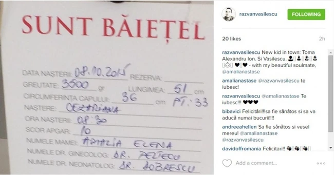 Bebeluşul s-a născut la ora 8.30, prin cezariană, a cântărit 3,5 kilograme şi a primit nota zece, potrivit unei fotografii publicate de Răzvan Vasilescu, soţul Amaliei Năstase, pe platforma online Instagram. „New kid în town (un nou copil în oraş-trad.): Toma Alexandru Ion. Şi Vasilescu“, a scris proaspătul tătic în dreptul imaginii.