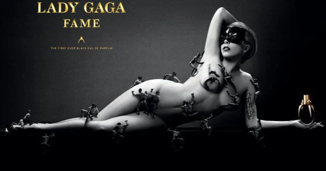 Intitulat sugestiv ,,Fame“ (faimă – n.r.), parfumul artistei în vârstă de 26 de ani beneficiază de un afiş pe măsură: Gaga poartă o mască neagră, iar pe anumite părţi ale corpului sunt acoperite de bărbaţi în miniatură.