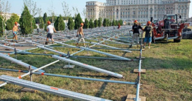 În centrul Capitalei s-a muncit de zor zilele trecute pentru ca Parcul Izvor să fie amenajat pentru cel mai impresionant show al momentului. Primele zece camioane cu tribunele pentru concertul Madonnei au parcat în faţa Palatului Parlamentului şi întreg parcul a fost împrejmuit de câteva zile cu şase kilometri de gard.