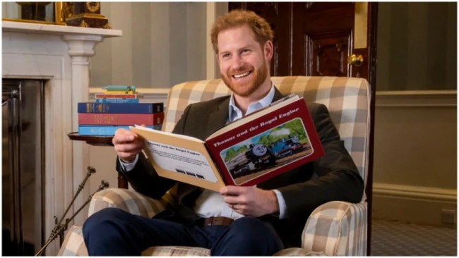 În introducerea înregistrată în luna ianuarie - înainte ca prinţul Harry să părăsească Marea Britanie împreună cu familia -, el stă pe un scaun, citind dintr-o carte despre aventurile trenului.
