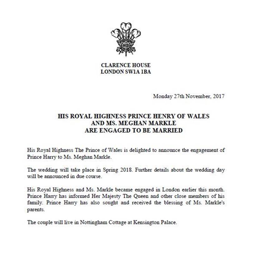 „Alteţa Sa Regală Prinţul de Wales este încântat să anunţe logodna dintre Prinţul Harry şi Meghan Markle. Nunta va avea loc în primăvara anului 2018. Mai multe detalii despre ziua nunţii vor fi anunţate în cursul acestei zile. Alteţa Sa Regală şi domnişoara Markle s-au logodit luna aceasta. Prinţul Harry i-a informat pe Majestata Sa Regina şi pe ceilalţi membri apropiaţi ai familiei. Prinţul Harry a cerut şi a obţinut binecuvântarea părinţilor domnişoarei Meghan Markle. Cuplul va locui în reşedinţa Nottingham Cottage din Kensington Palace“, se arată în anunţul oficial.