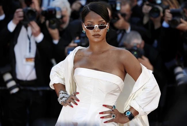 Ea a purtat un sacou de culoare taupe peste o cămașă mai închisă și pantaloni asortați. Rihanna a optat pentru o tunsoare blondă, cu breton, părul fiind îndreptat și o nuanță de ruj roșu aprins.