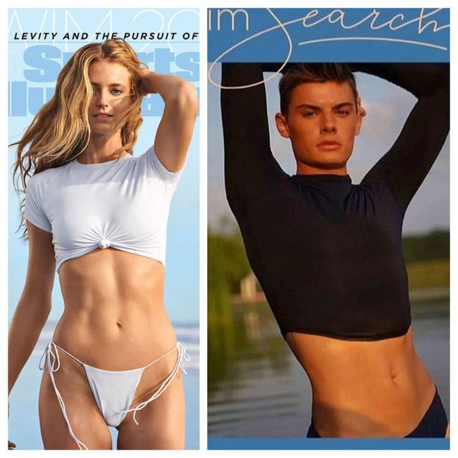 Un bărbat concurează alături de femei sexy pentru o copertă în costum de baie. Modelul androgin arată de minune în bikini