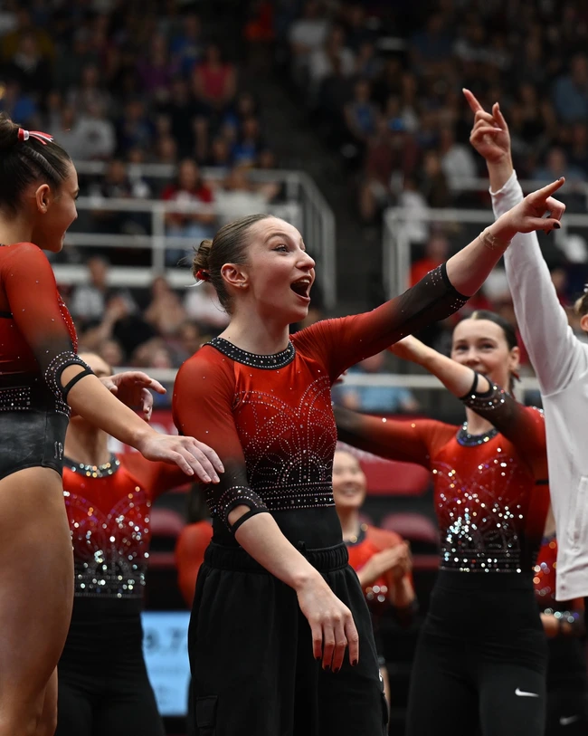 UCLA a ajuns la opt victorii în fața rivalei din Stanford, grație vedetei Jordan Chiles, care a contribuit major la succesul echipei sale, cu un total de 39,700 puncte (10 de la paralele, 9,9 la sol, sărituri și bârnă).