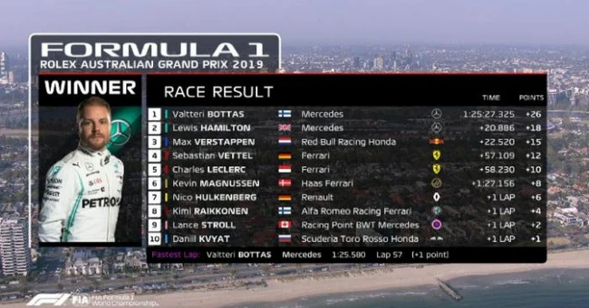 „A fost cea mai bună cursă din cariera mea şi am avut parte de o maşină extraordinară“, a declarat Bottas, la final, el reuşind să obţină şi punctul bonus pentru că a reuşit cel mai rapid tur în cursa de la Melbourne.