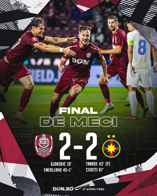 0CFR Cluj şi FCSB, vicecampioana și câștigătoarea titlului în sezonul trecut, au terminat nedecis, 2-2 (2-1), duminică seara, în Gruia. După 8n etape din Superliga, cele două formații rămân pe locuri de baraj, la coada clasamentului.