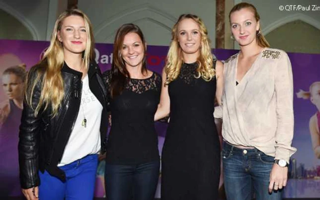 0Petra Kvitova (dreapta), la petrecerea jucătoarelor, alături de Azarenka, Radwanska şi Wozniacki FOTO QTF
